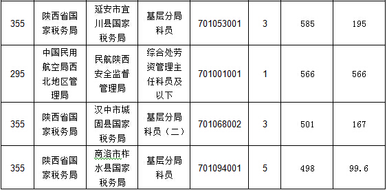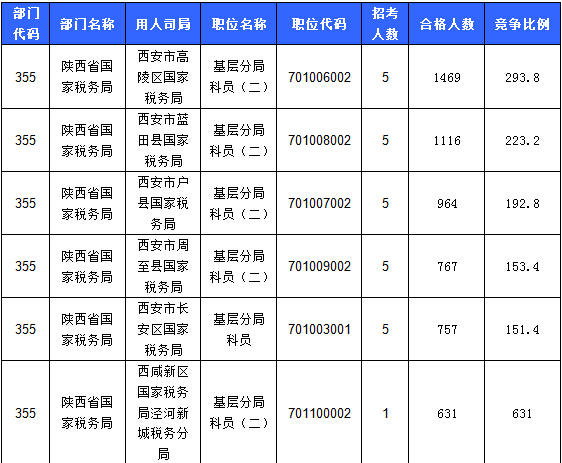 截止到24日18時,競爭最激烈的職位為陜西省國家稅務局西咸新區涇河新城稅務分局基層分局科員(二)一職,該職位招錄1人,通過人數為631人,競爭比高達631:1!