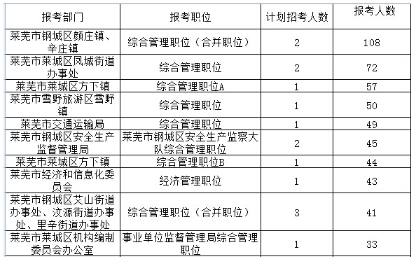 2016年萊蕪市所屬的職位中,報名人數最多的職位是:萊蕪市鋼城區顏莊鎮、辛莊鎮的綜合管理職位(合并職位),萊蕪市萊城區鳳城街道辦事處的綜合管理職位,萊蕪市萊城區方下鎮的綜合管理職位A,報名人數均大于50。
