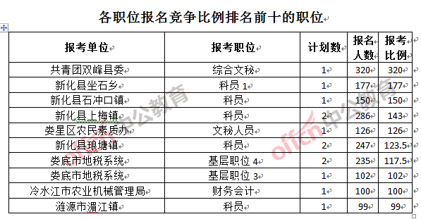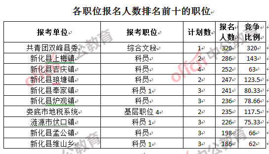 競爭熱門職位,前三位依次是:共青團雙峰縣委綜合文秘(競爭比例320:1)、新化縣坐石鄉科員1(競爭比例177:1)和新化縣石沖口鎮科員(競爭比例150:1)。