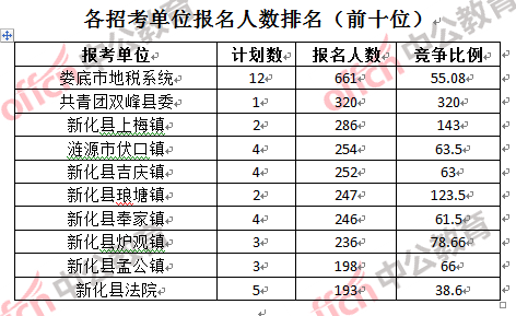 競爭熱門招考單位,前三位依次是:共青團雙峰縣委(競爭比例320:1)、新化縣石沖口鎮(競爭比例150:1)和新化縣上梅鎮(競爭比例143:1)。