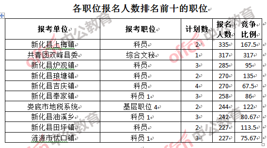 競爭熱門職位,前三位依次是:共青團雙峰縣委綜合文秘(競爭比例317:1)、新化縣石沖口鎮科員(競爭比例187:1)和新化縣上梅鎮科員(競爭比例167.5:1)。