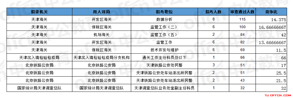 報名通過審核人數前十的職位主要集中在天津海關、北京鐵路公安局、天津出入境檢驗檢疫局等部門,具體信息如下: