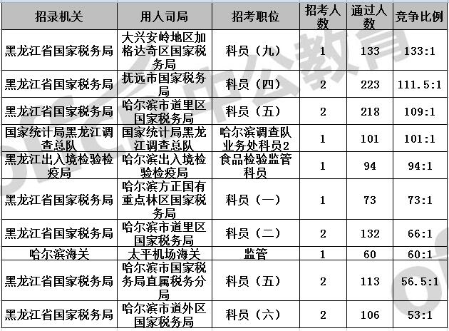 截止到11月1日16時,競爭比例的職位為黑龍江省國家稅務局大興安嶺地區加格達奇區國家稅務局科員(九)一職,招錄1人,截止到1日16時通過人數為133人。
