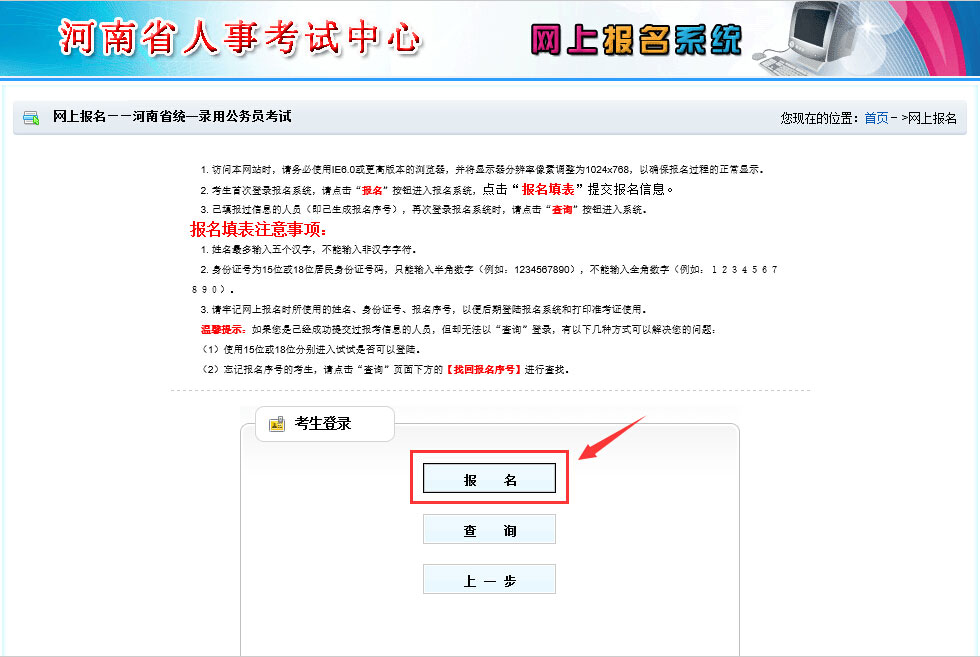 2015年河南公務(wù)員考試網(wǎng)上報名入口已經(jīng)開放,報名時間為9月14日8:00-18日18:00,希望大家不要錯過報名時間。中公教育河南中公網(wǎng)校小編特整理了今年河南公務(wù)員報名的流程,以供參考(以河南省直報名為例):