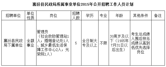 原標(biāo)題:臨汾市襄汾縣民政局2015年公開招聘工作人員公告