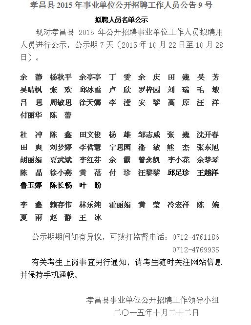 2015湖北孝昌縣事業單位招聘擬聘公告(9號)