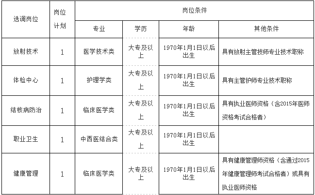 (一)選調崗位:共5名,詳見縣疾病預防控制中心2016年選調工作人員崗位計劃表;