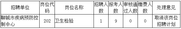 根據《2016年聊城市市屬事業單位公開招聘工作人員簡章》關于“報名結束后,對應聘人數達不到規定比例的招聘崗位,計劃招聘1人的,取消招聘崗位”的規定,經統計報考繳費人數,聊城市疾病預防控制中心衛生檢驗崗位應聘人數未達到規定比例,予以取消該崗位招聘計劃,特此公告: