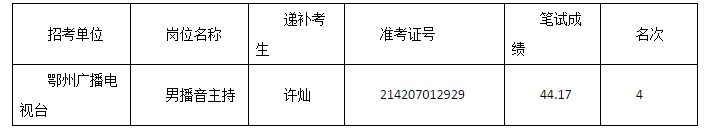 鄂州廣播電視臺2016年事業單位公開招聘男播音主持崗位資格復審,因第2名考生陳柚灼放棄資格復審,根據《鄂州市事業單位2016年度公開招聘工作人員公告》有關規定,在報考同一崗位考生中按照筆試成績從到低分依次遞補的原則,遞補以下考生為資格復審人選: