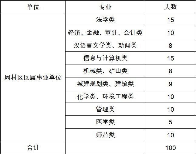 為加快實施人才強區戰略,進一步完善我區事業單位專業技術人員、管理人員隊伍結構,干部隊伍素質。經周村區委、區政府研究決定,面向全國招聘100名緊缺人才到周村工作。現將有關事項公告如下: