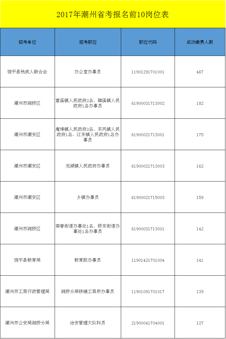 本次潮州考區共有11217人報名,有320個職位報名,本次考試平均競爭比例為35.05:1。本次考試職位競爭職位為饒平縣殘疾人聯合會辦公室辦事員(職位代碼11901291701001),招聘1人,有467人報名。