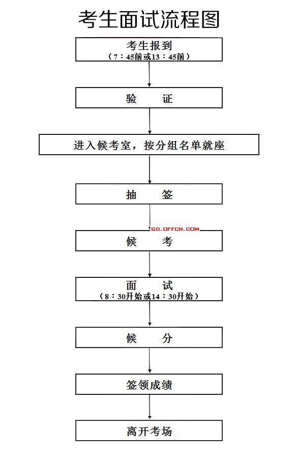 (二)考生須記住個人面試具體時間和所屬組別,按照公務員主管部門公布的面試時間與考場安排,在當天面試開考前45分鐘(即上午7︰45前、下午13︰45前)憑本人筆試準考證和身份證到指定考場報到,參加面試抽簽。《面試考生須知》《考生面試流程圖》見附件3、4。
