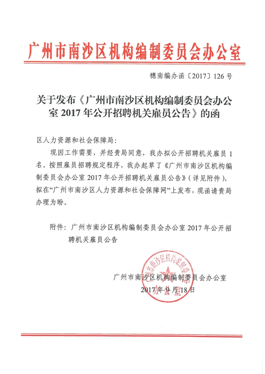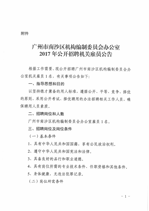 2017廣東南沙區(qū)機(jī)構(gòu)編制委員會(huì)辦公室招聘機(jī)關(guān)雇員公告【招1人】