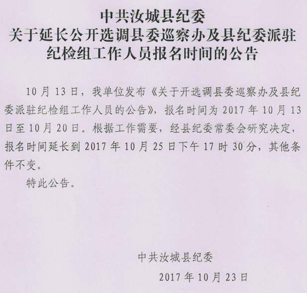2017湖南汝城縣委巡察辦及縣紀委派駐紀檢組選調報名時間延長通知
