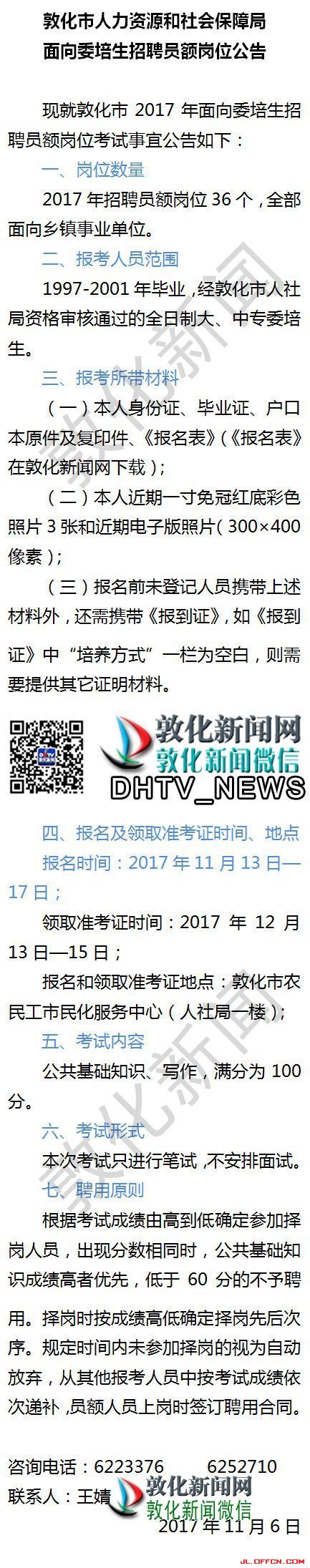 敦化市人力資源和社會局面向委培生招聘員額崗位公告,現就敦化市2017年面向委培生招聘員額崗位考試事宜公告如下: