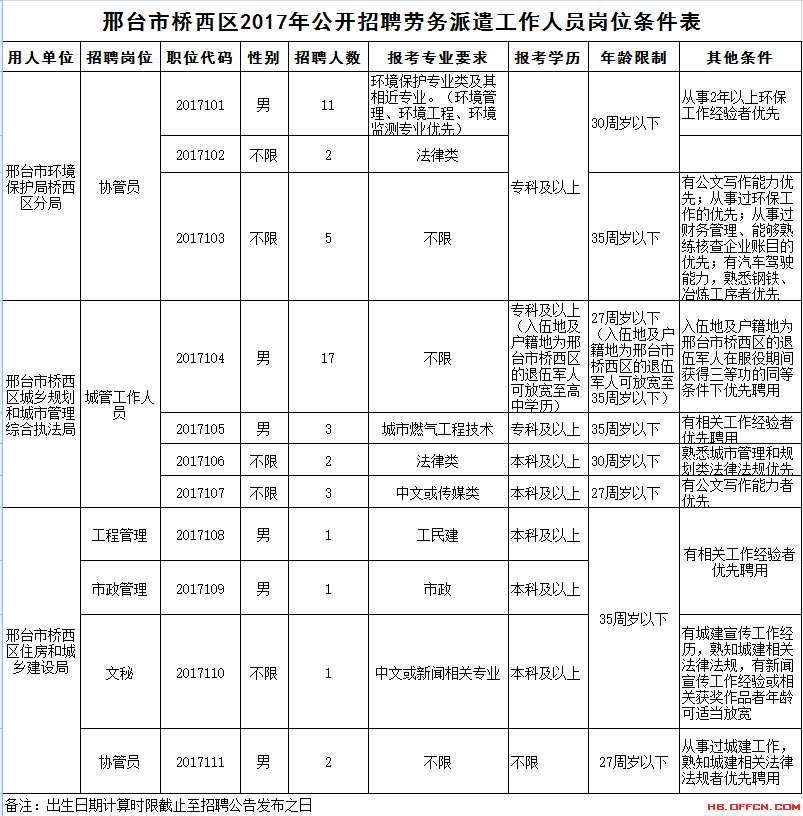 1、邢臺(tái)市橋西區(qū)2017年公開(kāi)招聘勞務(wù)派遣工作人員崗位條件表