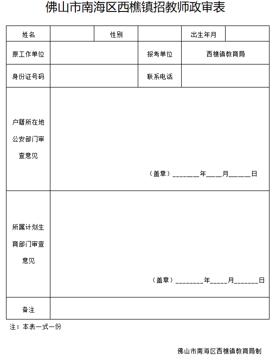 ①西樵鎮臨聘教師招聘報名審批表1份(見附件3,要求單張A4紙雙面打印,相片為近期大一寸彩照);