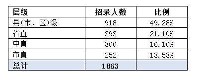 本次招錄涵蓋了各個層級,其中縣級占總人數比例,為49.28%,其次是省直機關,招錄398人,占總人數的21.1%,國稅系統為國家垂直機構,招錄300人,占到總人數的16.1%,市級招錄規模最小,僅招252人,占到總人數的13.53%。從這些數據可以看出,縣級職位機會,有志在2016年成“公”的考生要認真考慮縣級職位。